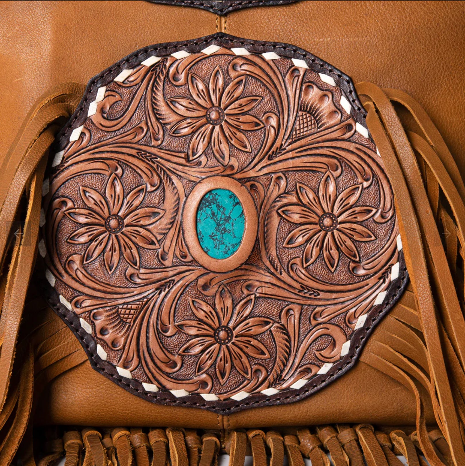 The shoulder strap is adjustable and made of 100% genuine vegetable tanned Cowhide Leather with a hand tooled pattern.