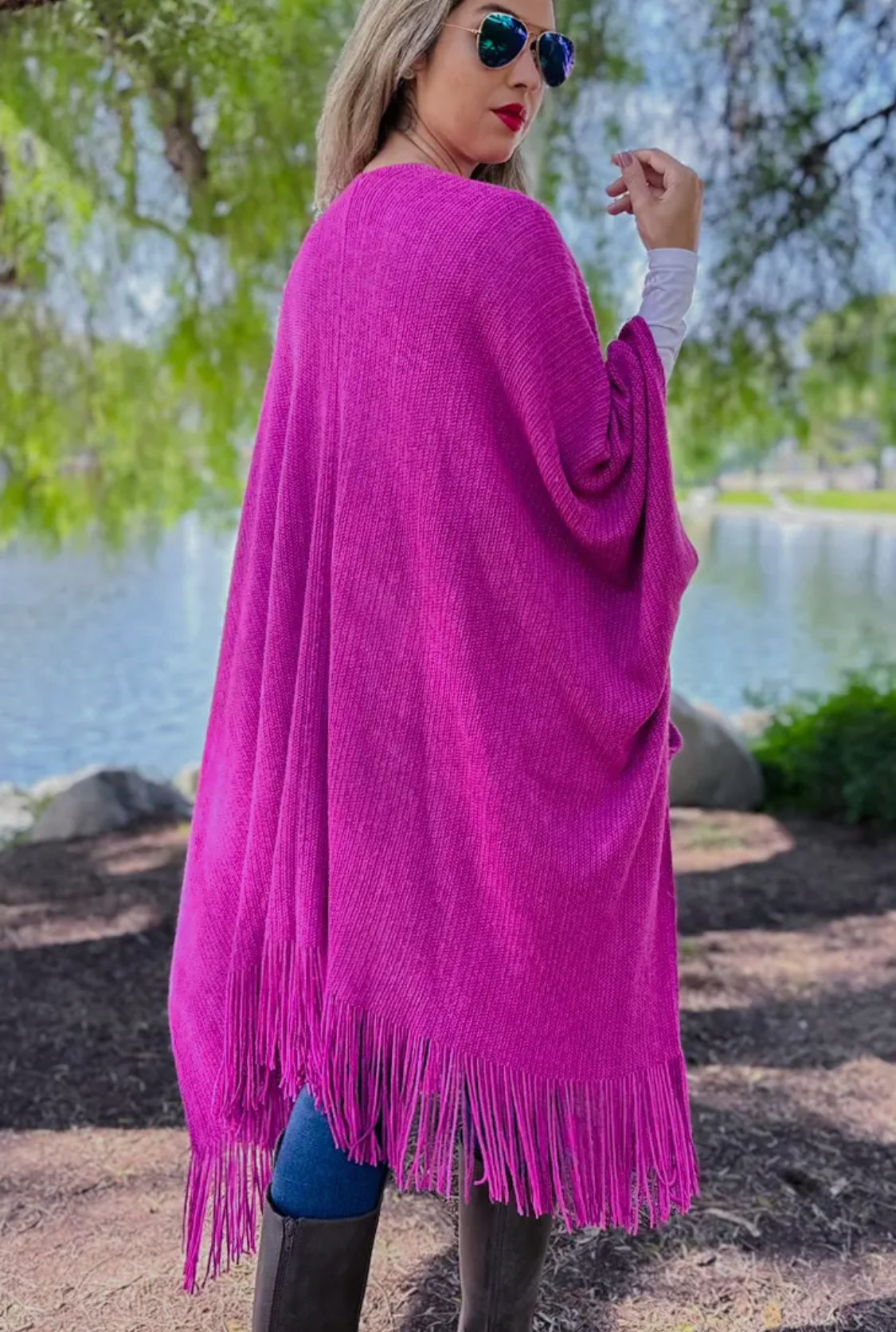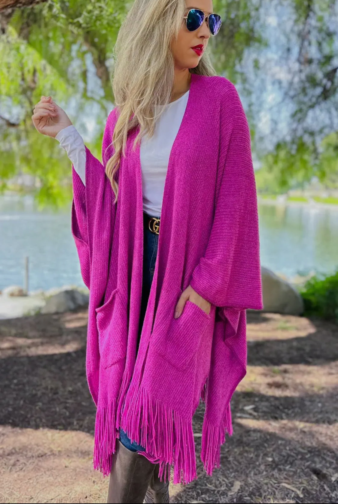 Fuchsia Pocket Kimono Cardigan with Fringe